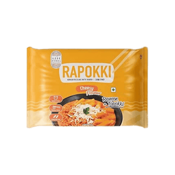 A rich and comforting Rapokki featuring cheesy sauce, ramen, and rice cakes.